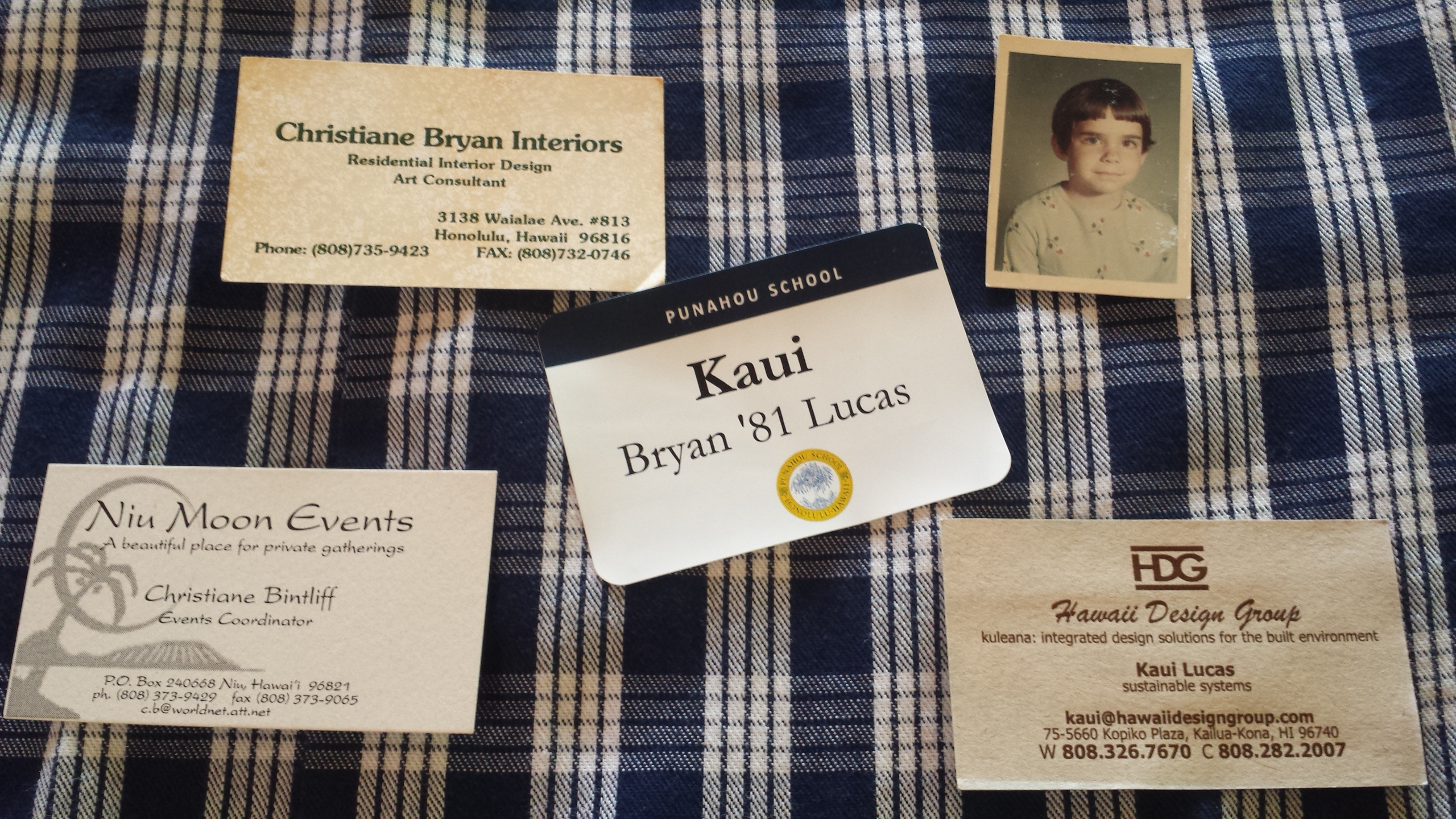 Even if more than anything save DNA, growing up in the Hawaiian archipelago has determined my path, I am puzzled when somebody asks me where I’m from, and then congratulates me, as if it were something I’d earned. I do take credit for choosing to live most of my life in Hawai’i, as well as editing that most usual of personal identifiers, my name. A couple of days ago at a high school reunion planning meeting I saw a version of my name I’d never seen before, Kaui (short for my middle name, Kaulana) Bryan (my maiden name) Lucas (my maternal grandmother’s name, which I took following a divorce in ’06 and absolutely love because it’s short and I don’t have to spell it.)