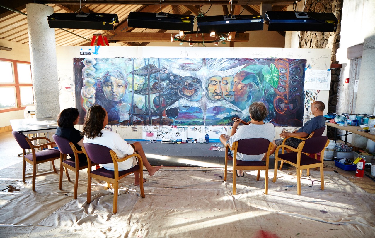 I left the Think Tech Hawaii studio and drove out to Camp Mokule’ia, where Mary and Jon Osorio and 65 other members of Calvary by the Sea Lutheran (ELCA) gathered for our annual weekend-long retreat. The same group of artists– Al Lagunero, Meleanna Meyer, Harinani Orme, Kahi Ching, Carl Pao & Solomon Enos – who made the mural exhibited at Mark’s Garage, also painted a couple of them on the campgrounds. As the weekend unfolded, the presence of Meyer and her collaborators, through the murals, provided a vivid backdrop for our community strengthening programs of yoga, dance, history, art, worship, etc. As I mentioned in the conversation with Meleanna, Where is the place for Native Hawaiians to gather and learn about our culture, history, without passing entrance exams based on foreign systems of education? Where is our place as a community to grieve the horrific 90% depopulation of Hawaiian people through the unintended (smallpox, syphilis, measles, etc) genocide of the 19th century? Why not build a puʻuhonua where we can bury the iwi with proper respect, teach ourselves and the children Hawaiian culture?